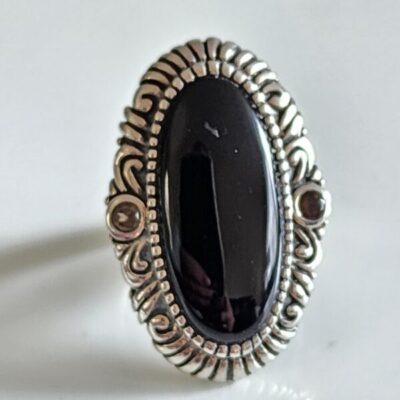 Sterling silver black onyx 18mm x 26mm, size 7, weighs 10.7 grams.