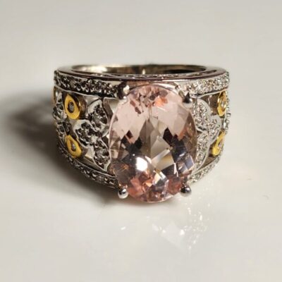 14kt white gold, oval morganite 10.89ctw, diamonds .16ctw, size 6, weighs 8.4 grams.